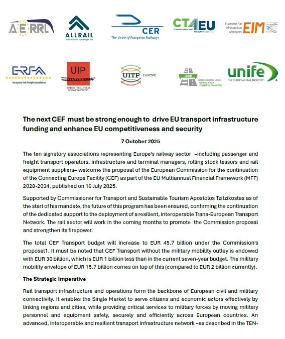 EIM, together with AERRL, ALLRAIL, CER, CT4EU, ERFA, UIP, UITP, UIRR, and UNIFE, welcomes the European Commission’s proposal to continue the Connecting Europe Facility (CEF) as part of the EU Multiannual Financial Framework (MFF) for 2028–2034, published on 16 July 2025. EIM emphasizes the critical importance of securing adequate funding for the deployment of interoperable systems across Europe (including ERTMS), as well as for the development of an efficient and sustainable European rail network. All major rail sector associations jointly call on Member States and the European Parliament to provide unwavering support for the CEF Transport programme, uphold its level of ambition, and take action to strengthen its capacity for the timely completion of the TEN-T network.
